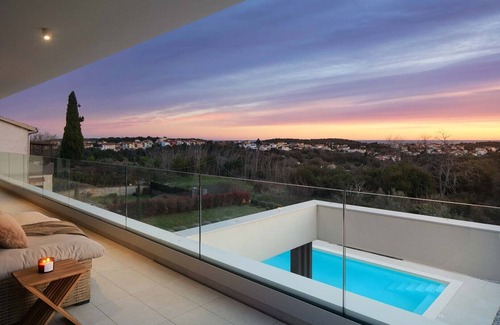 You will be amazed by the beauty and functionality of this modern beauty. It is in a small town near Pula, the largest city in Istria. The perfect location in a cul-de-sac with no traffic ensures constant silence. The villa is oriented to the southwest, and every room offers a beautiful view of the sea and nature. The modern interior will delight lovers of aesthetics. It consists of 4 bedrooms, each with a private bathroom. There are four bathrooms and an extra toilet and it is a proper choice for eight people. Each room has access to a spacious terrace that offers a unique view of the sunrise in the summer evenings. Villa is fenced so you have complete privacy. The outdoor area includes a large private hydromassage pool with salt water, an outdoor fireplace, a relaxation area, and a terrace. The nearest beach is only 600 meters away. Near are restaurants and shops. It is perfect for all lovers of a quiet vacation, in silence, and natural beauty, but it is also a perfect choice for adventurers. Nearby is Pula which offers a rich nightlife and various events, and on the other hand, there is beautiful Kamenjak. On Kamenjak you can see the remains of dinosaurs, many beach bars, beaches, and adventure bike trails.