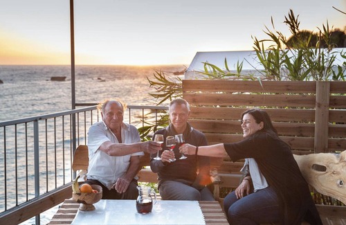 • The upper floor comprises two units, each with a private entrance. One is a main apartment featuring two bedrooms with private balconies offering breathtaking sea views, a well-equipped kitchen, a dining area, and a bathroom with a shower. The other is a cozy studio with a single bedroom, bathroom with shower and a balcony overlooking the ocean. While the studio does not include a kitchen, a fridge is provided for your convenience.
