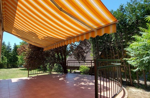 Single-family house "Violett". 4 km from the centre of Balatonmariafürdö, 15 km from the centre of Keszthely, 58 km from the centre of Siofok, in a sunny position in the residential district, 350 m from the lake. Private: property 400 m2 (fenced) with lawn and trees. Stepped path (4 steps) to the house. Parking on the premises, single garage. Shop 200 m, restaurant 100 m, grass beach 350 m.