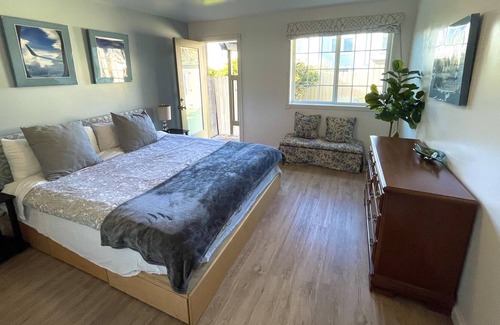 Our Moonlight unit has a private entry, ground level grannie apartment in a family residence. 680 square foot. Two furnished bedrooms. One walk-in closet. Big screened Milgard window looks out to quiet landscaped back yard. Newish full size refrigerator, Amish style cabinets, tile countertop, tile floor in kitchen. Hallway and bedrooms are carpeted. Recessed ceiling lighting. Good ventillation with front and rear windows. Four burner gas cooktop with powerful hood exhaust. Microve plus portable counter top electric oven. Use of new Samsung laundry appliances is included. Master bedroom has queen bed. Smaller bedroom has twin bed. Full bathroom with window to the outside. WIFI and furnace heat. proximity to Hwy 280 makes for an easy drive to Silicon Valley and downtown San Francisco.