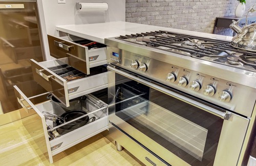 - A fully equipped European style kitchen, with custom Berloni cabinets, quartz countertops, a 5-burner gas range, and a breakfast bar that seats 4.