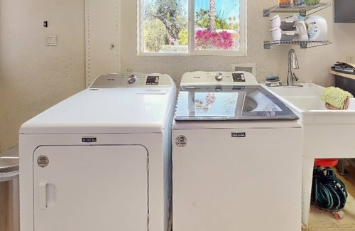 Welcome to your enchanting 1946 Spanish Colonial home, where timeless elegance meets modern luxury! Warm Sands Oasis is located on a quiet street in the tranquil Warm Sands neighborhood of Palm Springs. Step into the fully fenced and gated pet friendly yard, a private oasis surrounded by high privacy hedges. The new quartz bottom saltwater pool sparkles invitingly, perfect for a refreshing dip under the California sun. Soaring palm trees sway gently in the breeze, while citrus and olive trees offer a fragrant, Mediterranean touch. Blooming bougainvillea and palo verde add vibrant splashes of color, and the inviting landscape lighting transforms the property into a magical retreat by night. Whether you’re basking in the sun, counting stars on clear nights, or dining al fresco by the outdoor fireplace, it’s a slice of paradise, right in your own backyard!