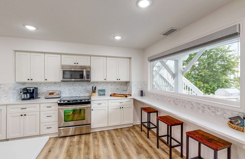 Upon entry, you'll be met with a bright interior and a cozy atmosphere throughout the well-appointed living area. Marvel at the newly remodeled space that boasts upscale furniture, luxury vinyl plank floors, and a blanket of natural light. Relax and make yourself at home by resting on the plush furniture, indulging in a favorite show on the TV, or serving brunch on the expansive deck. Prepare grand meals and lake picnic snacks in the open-concept kitchen, equipped with stainless steel appliances, ample cupboard room, a floating island breakfast bar, and a formal dining table. This kitchen is spacious and boasts enough room for everyone to get a bite.
