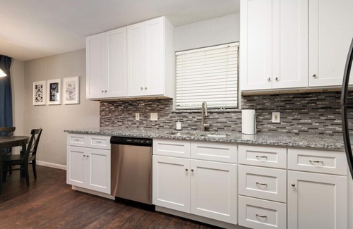 This 1,300 sq ft duplex is spread over two levels and designed for comfortable, easy living. Upstairs, you'll find all three bedrooms along with two full bathrooms. The main floor includes a cozy dining area, a fully equipped kitchen, a half bathroom, and a living room with a desk and wifi. Each bedroom features a flat-screen TV for relaxing evenings. A washer and dryer are located in the garage. Outside, enjoy a small fenced yard and covered patio.