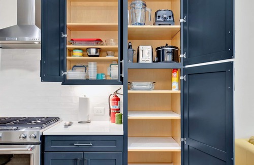 - Main Level: Open-concept living + dining with a fully stocked kitchen for cooking or takeout nights. Plus access to the outdoor patio with outdoor couch seating, table, and large shade umbrella.