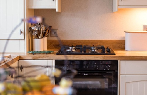 This welcoming, sociable space has a dining table that seats four easily and opens into a well-equipped kitchen area. A large butcher's block provides additional worktop space. Hidden behind the pale, shaker-style doors you'll find everything you need for a self-catering holiday, including a dishwasher and plenty of cookware, should the urge to bake come over you. There's also a gas hob and electric oven, a full-size fridge-freezer and a washing machine and double doors that can be thrown open to the enclosed courtyard to let the fresh air in.