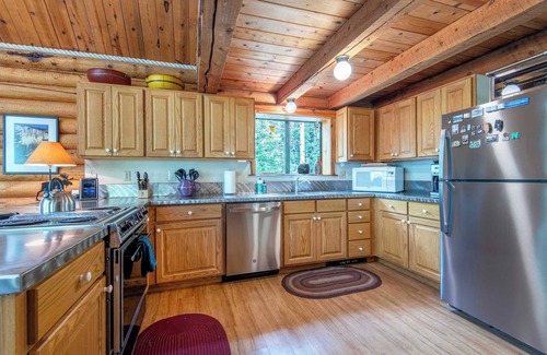 Inside, you’ll find a warm and rustic interior with exposed log walls, vaulted ceilings, and large windows that blur the line between indoors and nature. A brand-new grill and ping pong table add even more fun to your mountain escape.