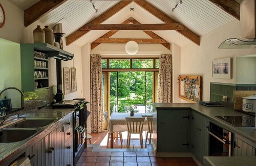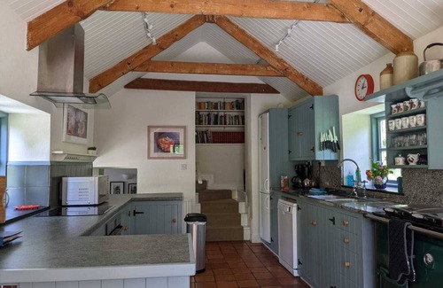 Up a small flight of stairs is a lovely kitchen with wooden beams and full length doors leading to the patio. It has views across the garden and a table to comfortably seat 8 . The kitchen has a fridge-freezer, fan oven, induction hob, Rayburn, microwave and dishwasher.