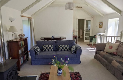 A further flight of stairs leads you to a large living room with views of the garden and church, there are comfortable sofas and a fantastic log burner (Internet TV, Wi-Fi provided).