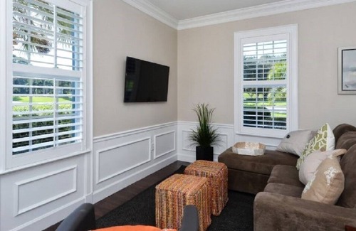 Completely furnished studio with a wonderful view of the adjoining lake and the golf course behind it. On 680 sqft living space a living-, eating and sleeping area awaits you. The bathroom has 2 separate sinks, a walk-in shower, a toilet, a washing machine and dryer. The kitchenette includes dishwasher and refrigerator as well as granite countertops, two burner stove, microwave and Keurig coffeemaker. The Smart TV provides entertainment for everyone. The queen bed has a TempurPedic mattress and the sleeping sofa offers space for additional 2 people.