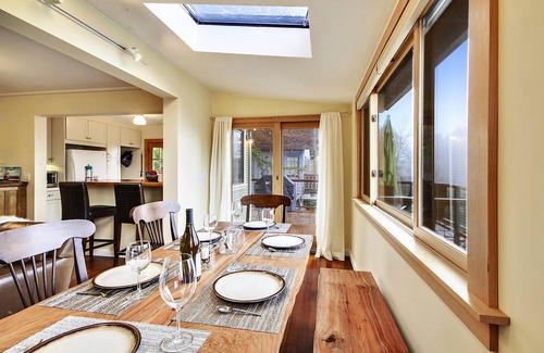 The kitchen is open to the dining and living areas so friends and family can gather to laugh and chat while cooking. Dine inside or out as weather permits. A new hot tub joins the outdoor dining area on the main deck overlooking the river.