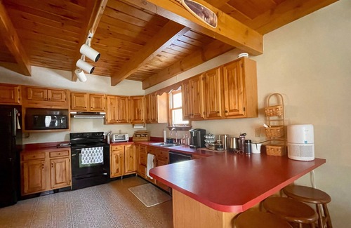 -Spacious well stocked kitchen with full sized refrigerator, electric stove/oven, microwave, toaster oven, Keurig coffee maker, french press, electric water kettle, and dishwasher.
