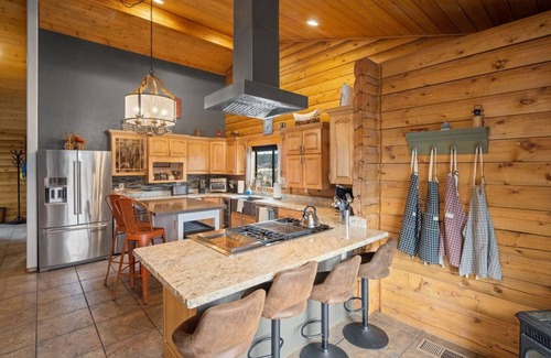 Inside, the cozy living room and lounge areas offer plenty of space to kick back, watch movies, play games, or simply enjoy the warmth of the log cabin ambiance.