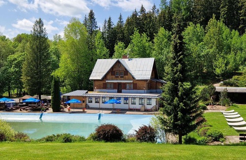 This holiday rental is a beautiful and comfortable three-story detached chalet located in a resort with seven houses. The property offers a range of amenities, including a swimming pool (available seasonally from June 26 to September 3), a yard, internet WiFi, and parking for up to 12 cars. The Villa Katka chalet provides a tranquil and sunny setting, situated just 50 meters from the edge of the forest and 2 kilometers from the skiing area in Dvůr Králové Nad Labem, Czech Republic.