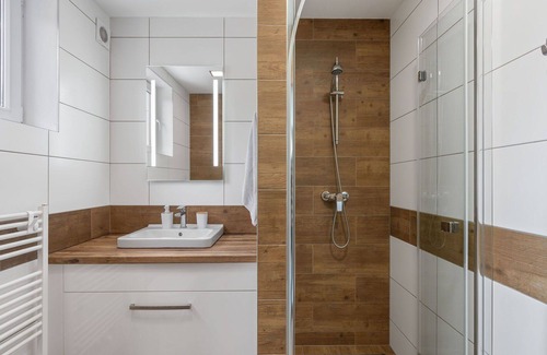 You will be staying in an 8-room chalet that spans across 3 levels, featuring spacious and beautiful wooden furnishings. The open living/dining area is accompanied by an open-hearth fireplace, a dining nook, a bar, and cable TV. The well-equipped kitchen comes with a dishwasher, a gas stove with 5 gas rings, a kettle, a microwave, a grill, and an electric coffee machine. There is also a separate WC on this level.