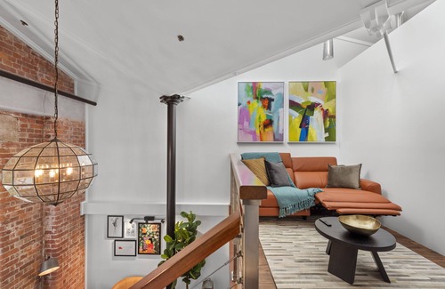 Oozing New York loft-style architecture, exposed brick walls, steel beams, double height pane glassed windowed ceiling, sky lightwells in both upstairs + downstairs bedrooms …