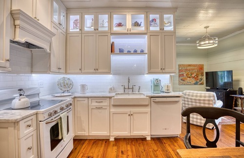 The picturesque cottage is surrounded by live oaks, magnolias, azaleas, and camellias. Old heart pine floors, Persian carpets, and original shiplap walls create a cozy ambiance. The completely renovated kitchen and bathrooms sparkle with pristine modern fixtures and marble. The immaculate kitchen is fully stocked with dishes, flatware, pots, coffee maker, blender, and toaster. Two bedrooms offer a king-sized bed in each, luxury mattresses, and fine linens. One full bath (walk-in shower) and an additional powder room. Cable television, washer/dryer, and wireless internet are provided, and the cottage offers central heat and air.
