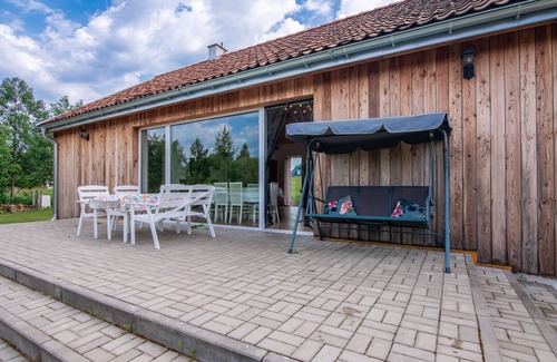Single-family house "Zagroda nad Krutynią", built in 2022, surrounded by trees and meadows. Outside the resort, in a quiet, sunny position, 300 m from the lake, 500 m from the river, in the countryside. Private: property 15'000 m2, meadow 1'000 m2, pond. Hot tub, table tennis, terrace (30 m2), garden furniture, barbecue, children's playground. In the house: WiFi, sauna. Available: bicycles, canoe. Motor access to 50 m from the house (via unmade road). (1 step). Parking at the house. Shop 1.5 km, grocery 1.5 km, restaurant 1 km, bus stop 1.5 km, railway station 2 km, sandy beach, public bathing area 300 m. Children's playground 500 m. Nearby attractions: Ruciane Nida 22 km, Mikołajki 37 km, Krutynia 500 m.