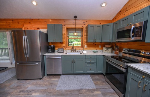 Situated in a quiet and private neighborhood, Zen Den offers breathtaking mountain and wooded views from its oversized patio and balcony, where guests can enjoy morning coffee accompanied by birdsong. The allure of relaxation continues with a luxurious hot tub and a fire pit, ideal for cozy evenings under the starlit sky.