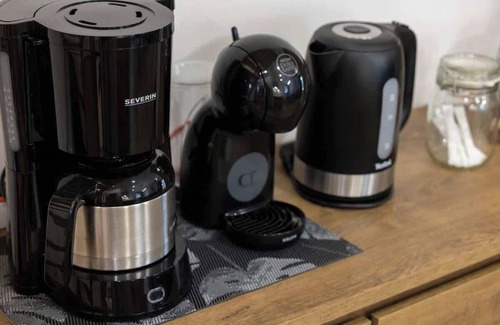 A table with 6 chairs, dishwasher, induction hob, microwave oven, coffee maker, toaster, fridge, kettle, kitchen utensils; dishes, cutlery, pots, frying pan, wine glasses