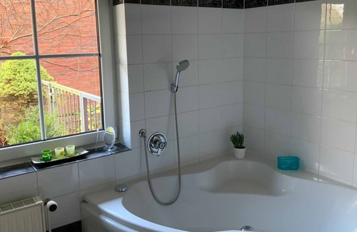 Holiday house at Jade Bay Ahornstraße 2 Varel-Langendamm. A modern and chic two-family house. The ground floor for 2-4 people, about 95 square meters in a quiet residential area, in a side street. Approximately 5 km from the North Sea resort of Dangast, with a beach, sea water bath, world nature portal, cafes and restaurants, as well as children's playgrounds etc. The pedestrian zone of the city of Varel is only 3 km away. W-LAN, large enclosed garden with garden furniture, garage, equipment includes color TV with cable TV, stereo, electrical kitchen appliances as well as washing machine and dryer. Garage and garden exclusively for the ground floor apartment.